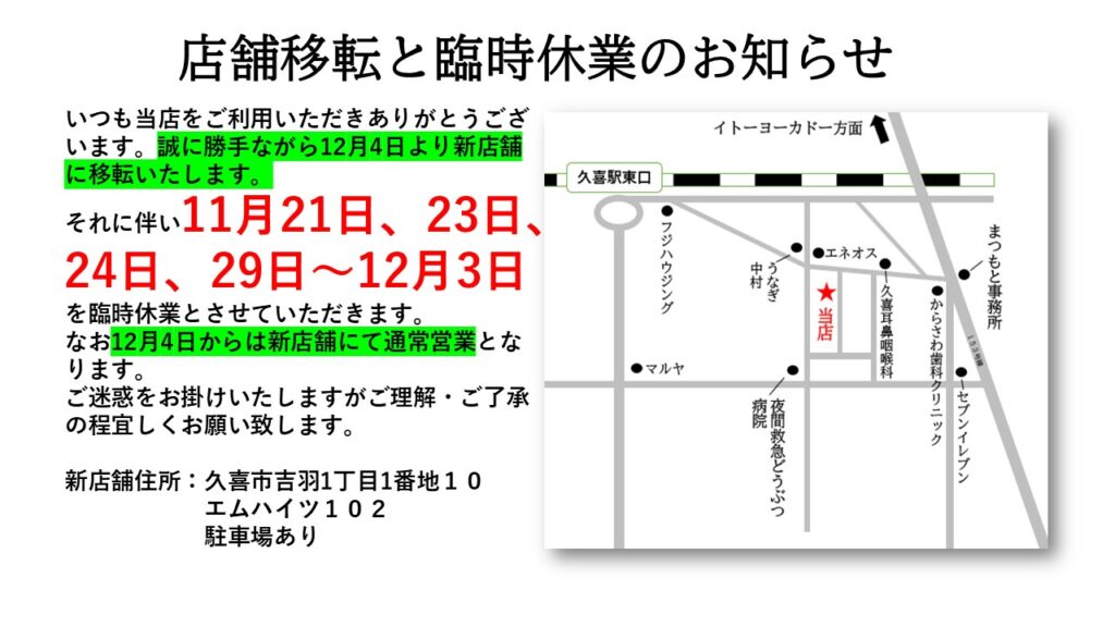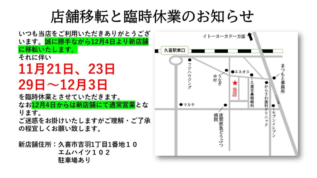 【月・木・土曜日】14:00~18:00 【金・日曜日】10:00~13:00(営業時間外もご相談ください)